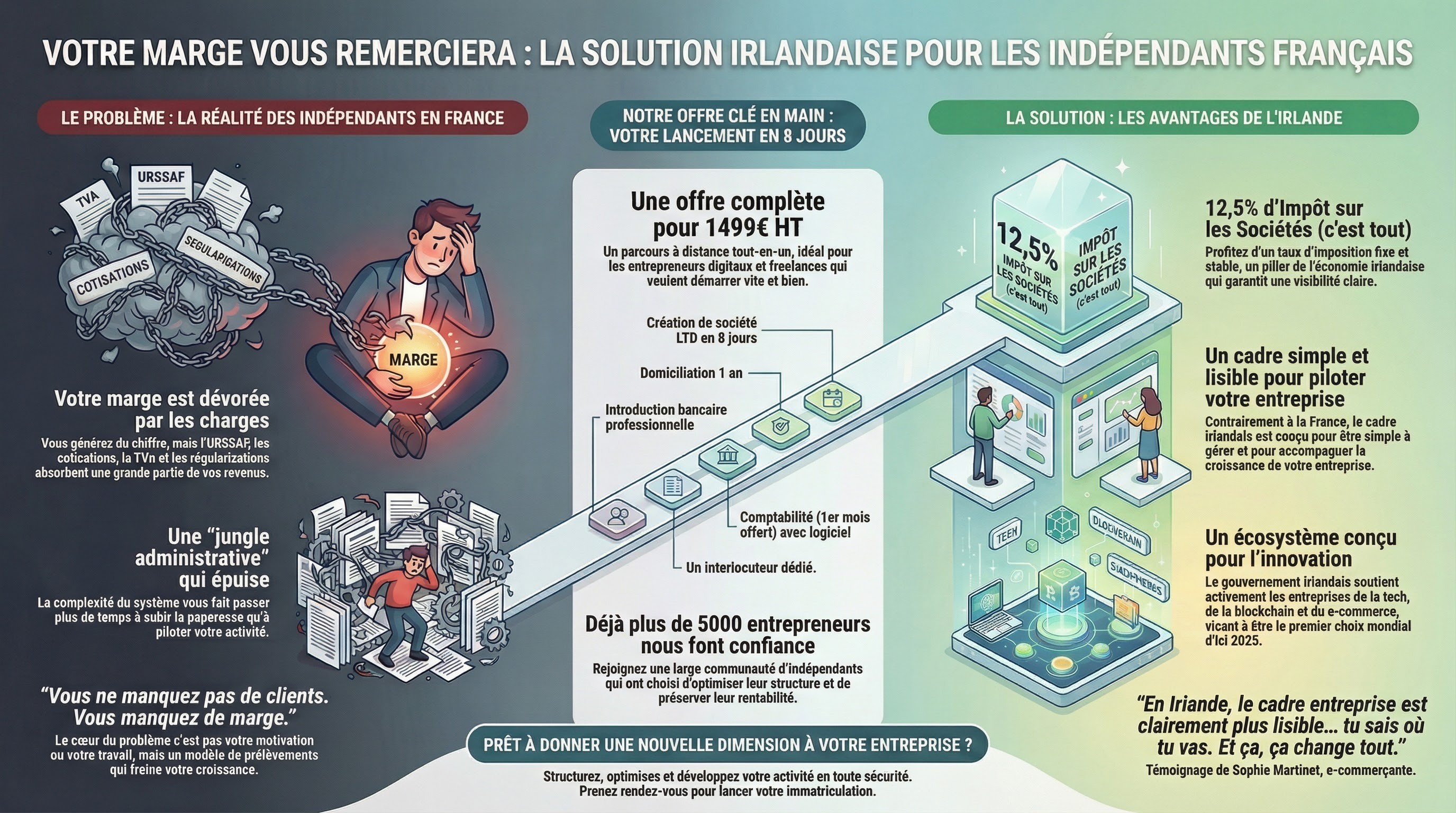 vous générez du chiffre, et vous avez l’impression que tout part en cotisations, TVA, appels de charges, régularisations, paperasse. Résultat : fatigue, frustration, et une entreprise qui stagne parce que la marge ne suit pas. Nous, on ne vend pas un “tour de magie”. On vous aide à structurer légalement votre activité avec une société irlandaise quand c’est pertinent.